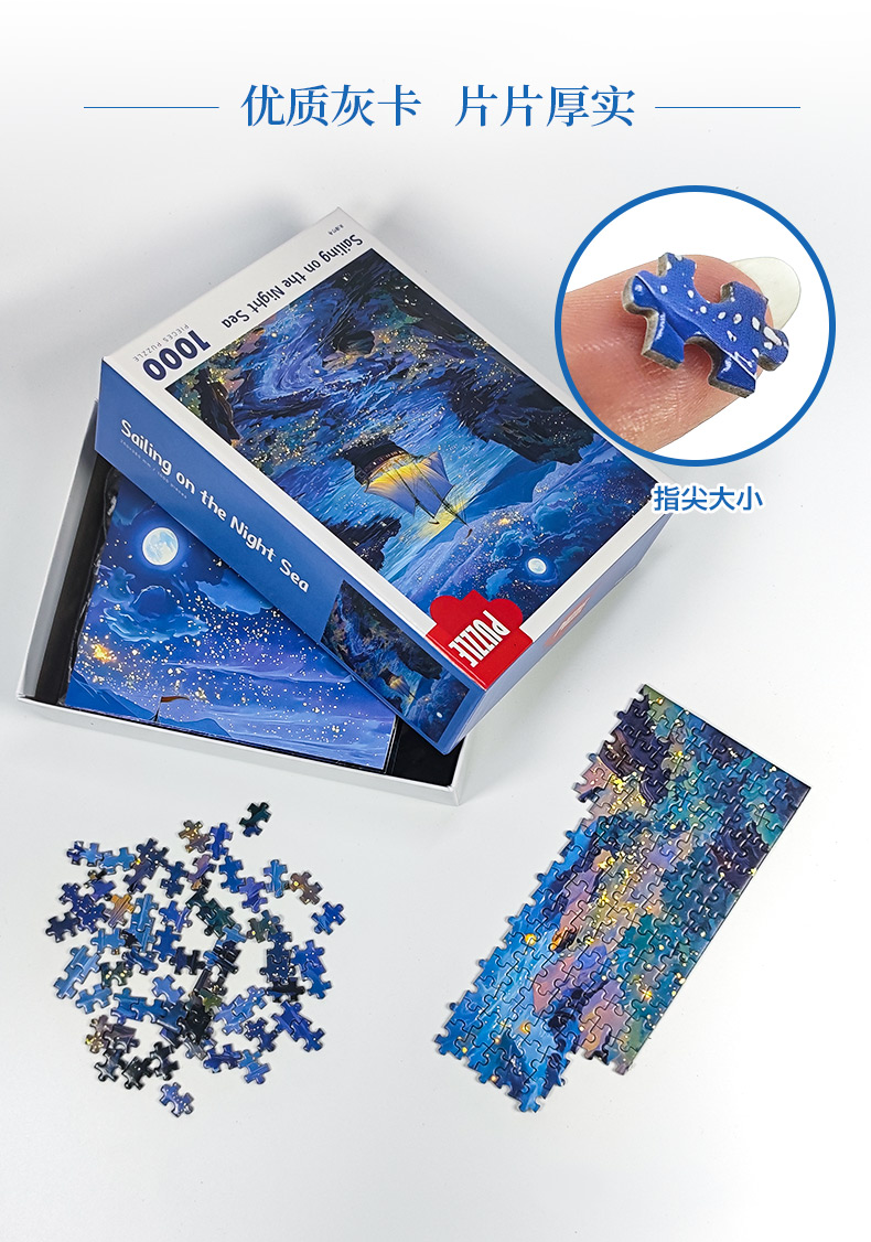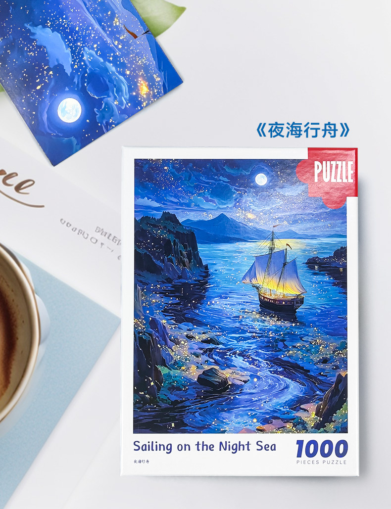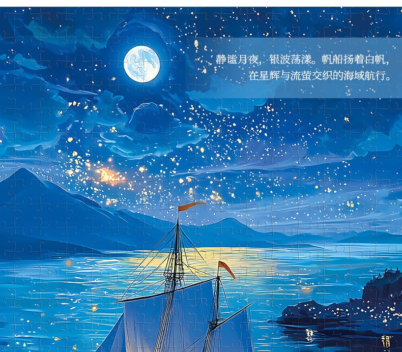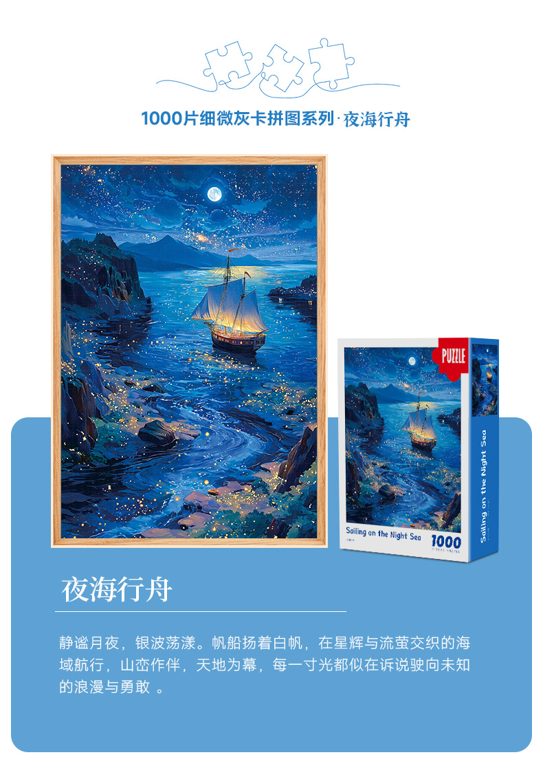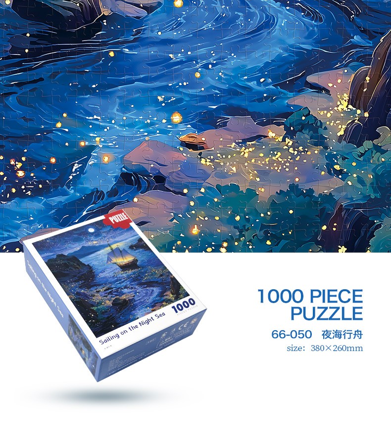 拼圖名稱:夜海行舟66-050 拼圖尺寸:380*260MM 拼圖片數(shù):細(xì)微灰卡1000片 加工方式:廠規(guī)、來(lái)圖定制 包裝尺寸:180*130*50mm
